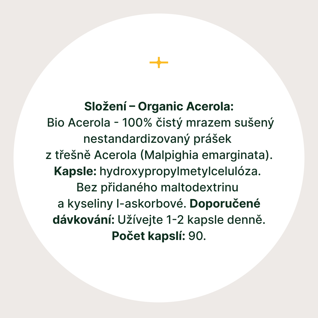 Jedna kapsle obsahuje minimálně 75 mg vitamínu C obsaženého v acerole — což podle údajů výrobce odpovídá aktivnímu obsahu významně vyššímu než vitamín C v běžných citrusových plodech. Produkt je navržen tak, aby sloužil jako každodenní podpora imunitního systému, přispěl k normální funkci kostí, chrupavek, kůže i cév, a pomáhal snižovat únavu a vyčerpání.