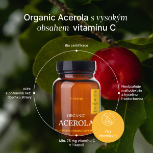Organic Acerola od značky Trime je prvotřídní doplněk stravy, vytvářený výhradně z mrazem sušeného prášku z třešně aceroly (Malpighia emarginata) pěstované v ekologickém režimu. Na rozdíl od běžných vitamínu C přípravků nejde o izolovaný ascorban sodný či syntetickou kyselinu askorbovou, ale o kompletní přírodní matrix — tedy i s fytonutrienty, flavonoidy, karotenoidy, minerály a stopovými prvky, které acerola obsahuje. Tento přirozený komplex se navíc vyznačuje lepší biologickou dostupností díky synergii složek.